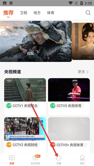 1、在视频软件首页,点击底部的【热播】按钮,即可进入热播板块浏览各类频道的节目内容。