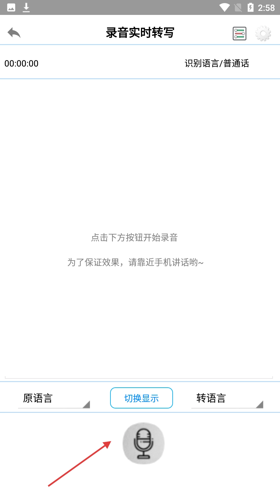 4、在录音实时转写页面,点击下方麦克风按钮开始录音,可切换原语言和转语言,靠近手机讲话以保证识别效果。