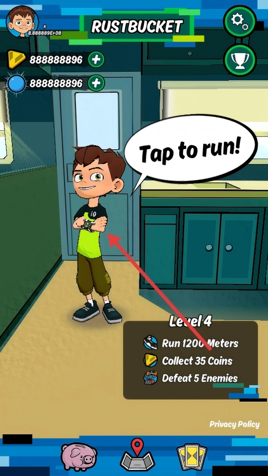 1、打开RUSTBUCKET游戏,找到Level-4的三个目标,点击角色旁“Tap-to-run!”的提示,开始跑酷。