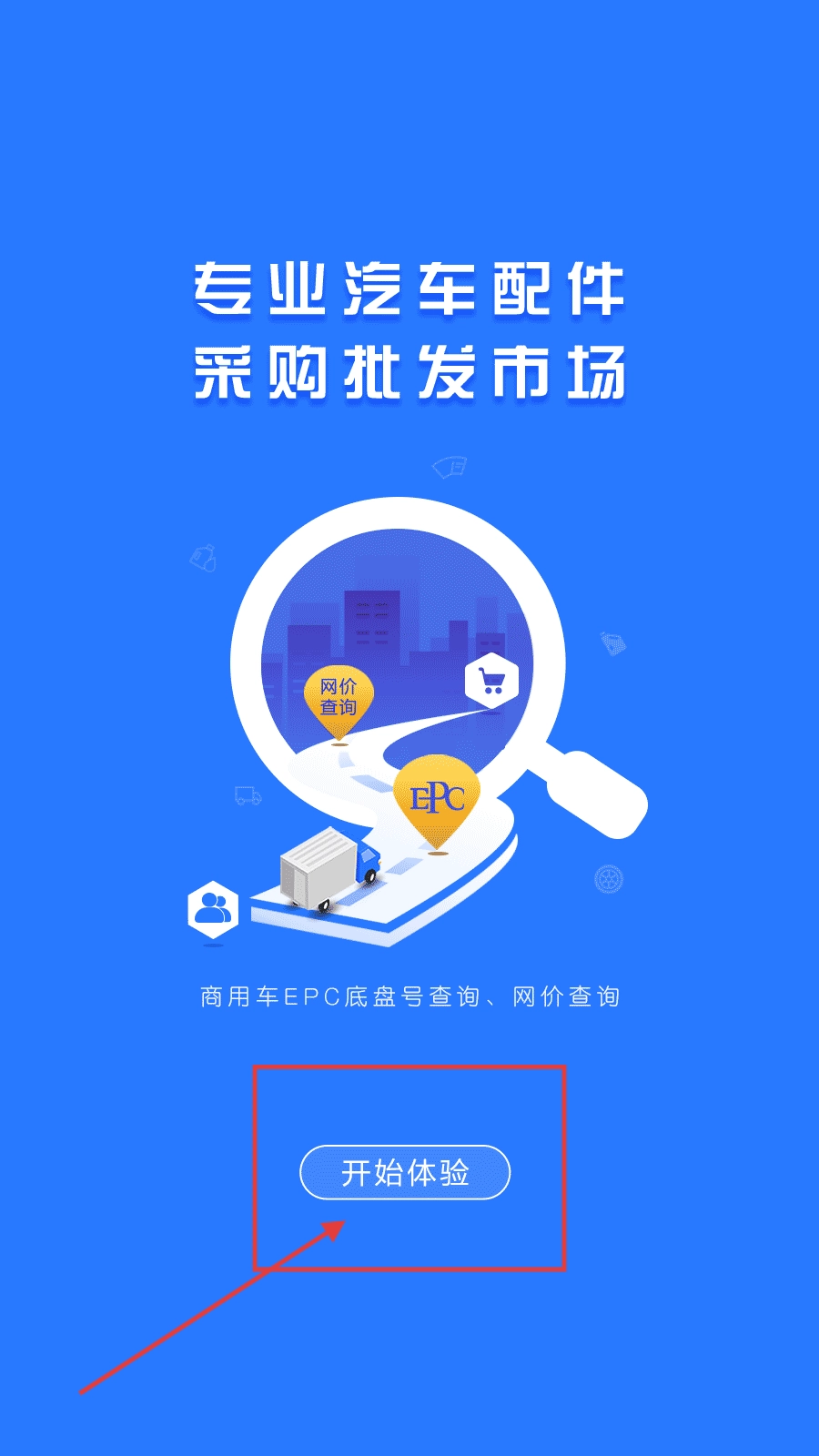 在专业汽车配件采购批发市场的启动页面,点击【开始体验】按钮,即可进入汽配人主界面。