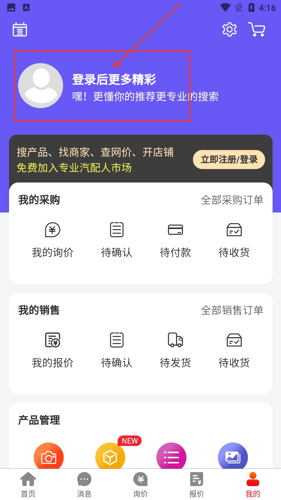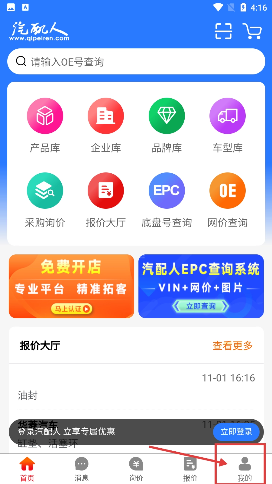 2、在汽配人首页,点击底部导航栏的【我的】选项,可进入个人中心页面。
