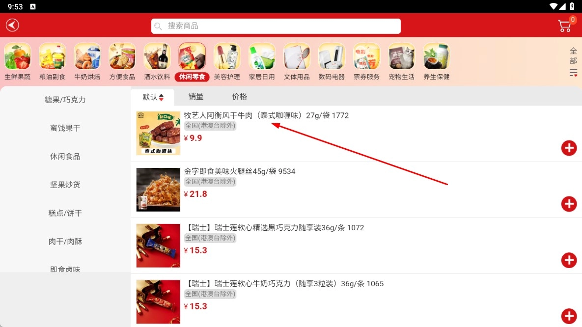 3、在休闲零食列表,点击【牧艺人阿衡风干牛肉-商品名称】,查看商品详情。