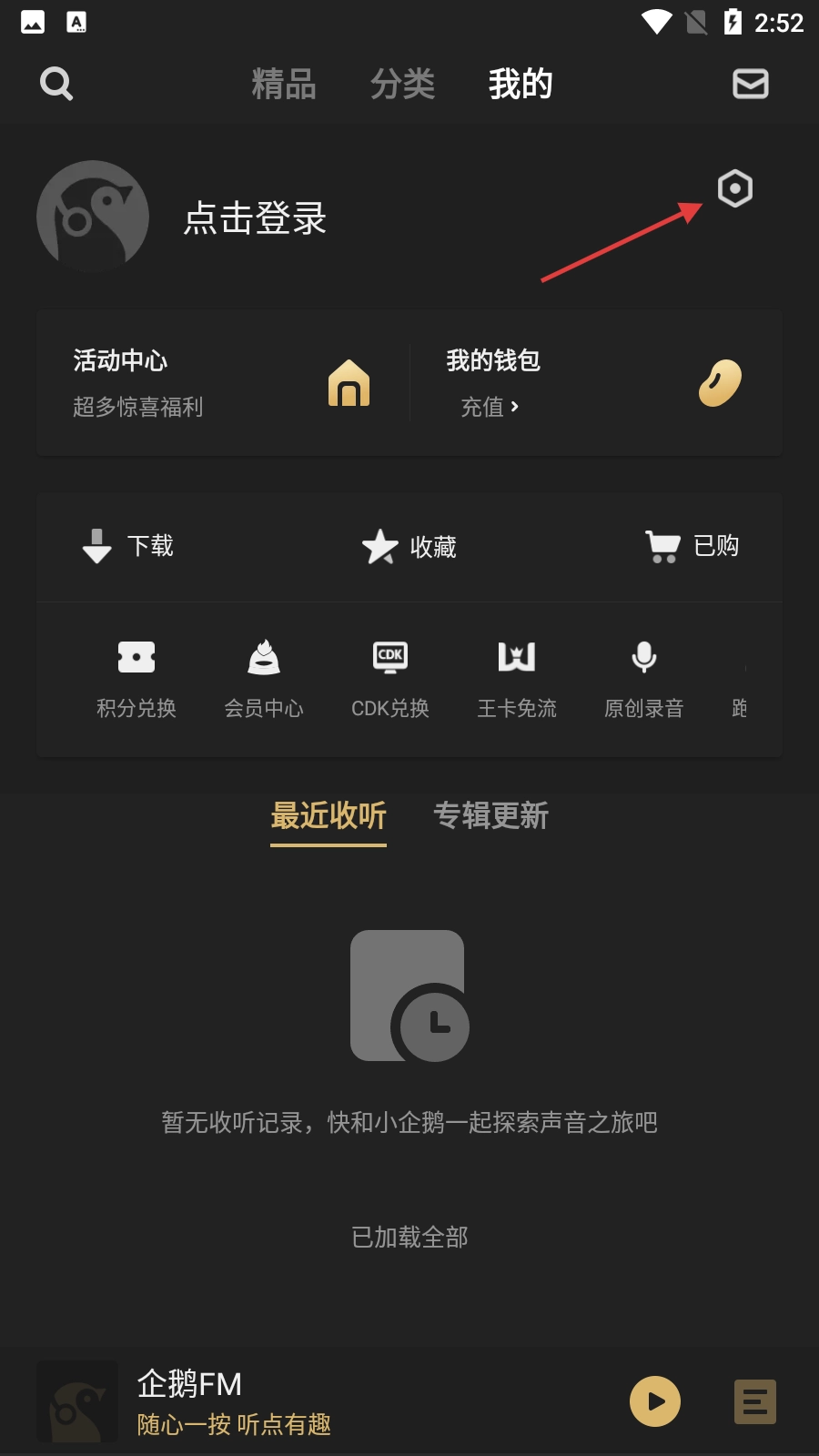 1、打开【企鹅FM】,进入【我的】页面,找到右上角的【设置】图标并点击,即可进入设置界面开展后续操作。