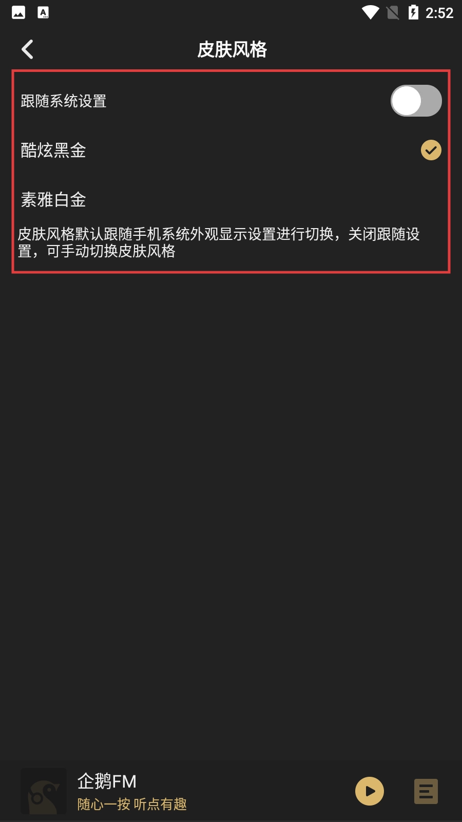3、在【皮肤风格】设置界面,可看到有【跟随系统设置】【酷炫黑金】【素雅白金】三种选择,默认可跟随系统或手动选择风格。
