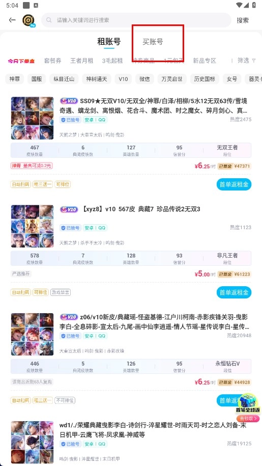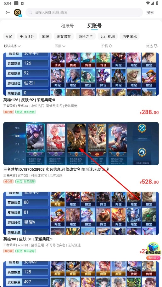 3、在买账号板块,选择感兴趣的王者荣耀账号,如带有特定英雄、皮肤的账号,进入账号详情页。