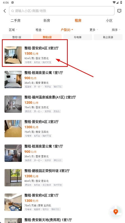 3、在筛选结果,点击【整租·晋安府A区3室2厅-房源】,查看房源详情。