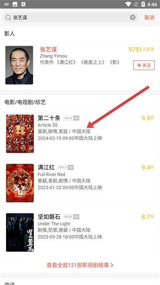 2、在搜索结果中,可查看【艺人-代表作】以及【电影-评分/上映时间】等信息,点击【第二十条】。
