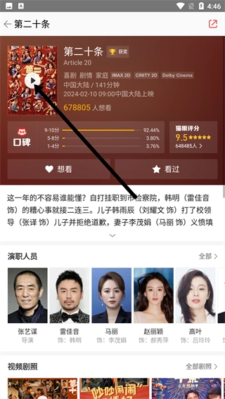 3、进入电影详情页,可查看【影片评分-剧情简介-演职人员】等信息,点击【播放】即可查看影片预告片。