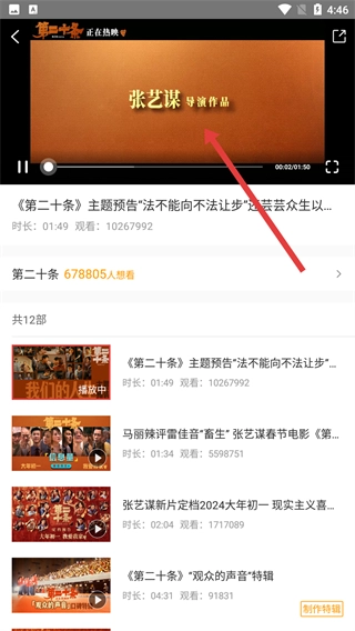 4、在影片详情页中,点击视频区域可观看【电影预告-特辑】等内容,还能查看相关视频列表选择观看。