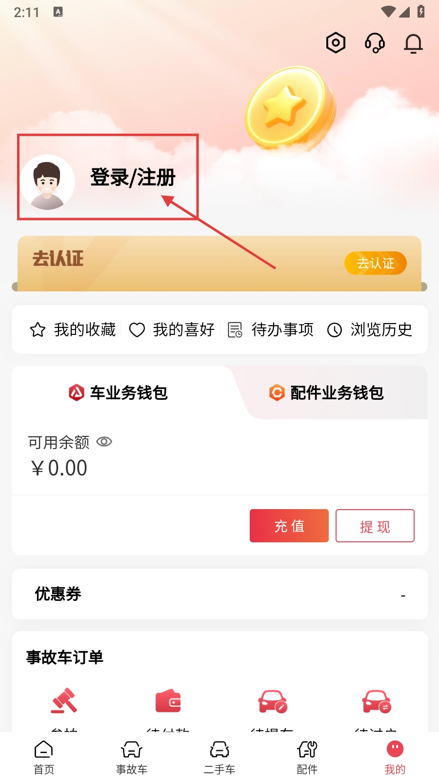 2、在个人页面,点击【登录/注册】区域,进入登录选择界面。