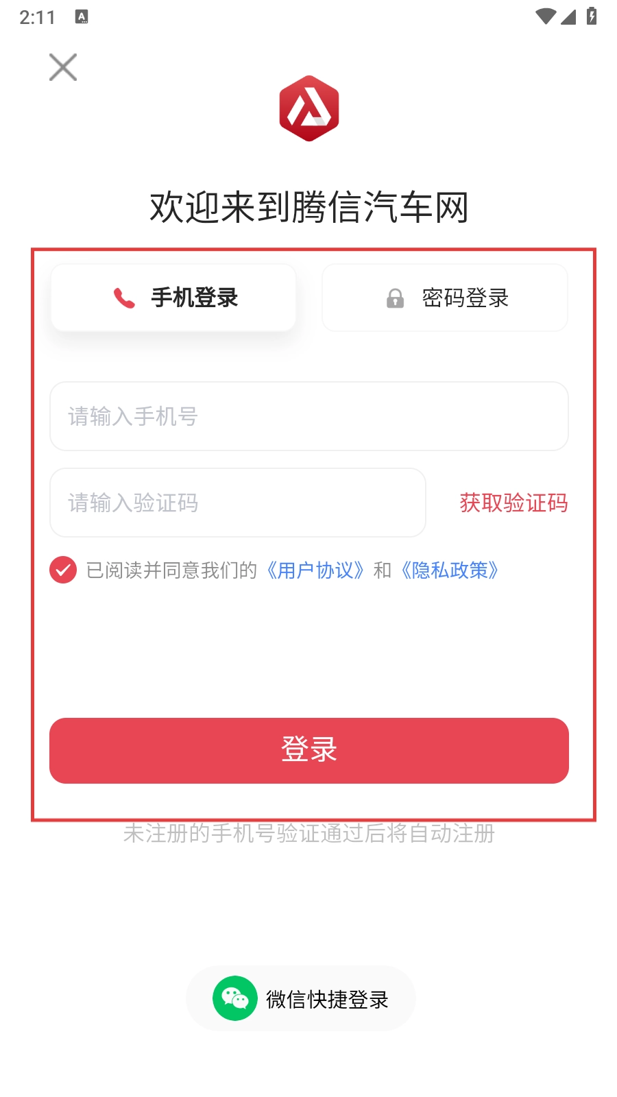 4、 若选择【密码登录】,输入手机号和密码后点击【登录】;若未注册,可点击【注册】进行账号注册。