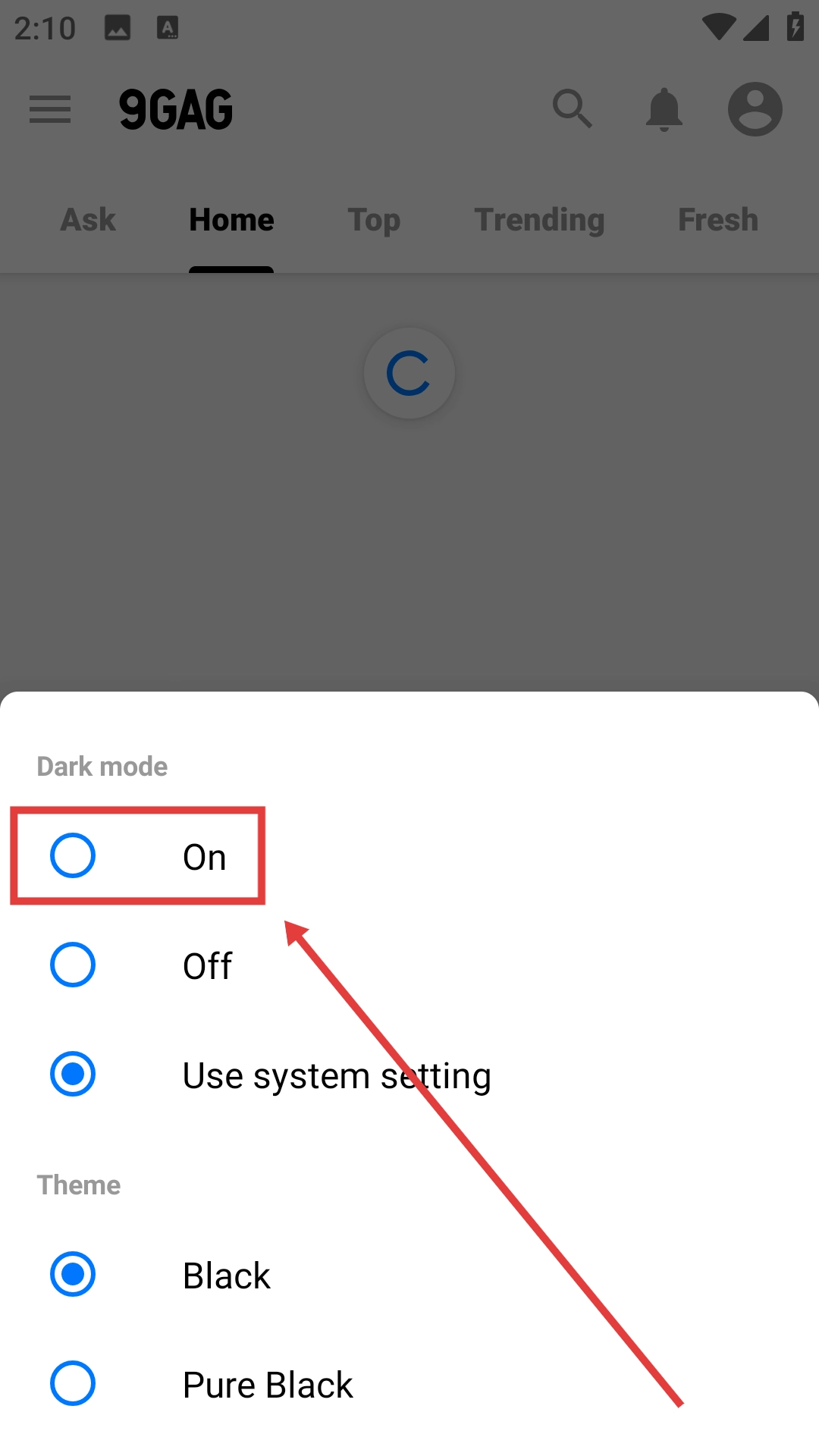 3、在设置界面选择【On】,开启深色模式。