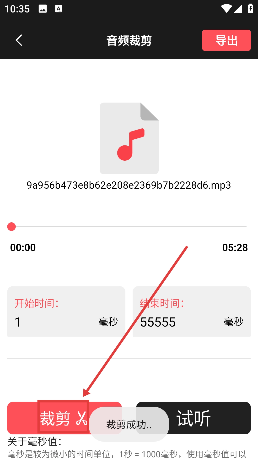 3、在音频裁剪界面设置【开始时间】和【结束时间】(如开始时间1毫秒,结束时间55555毫秒)。