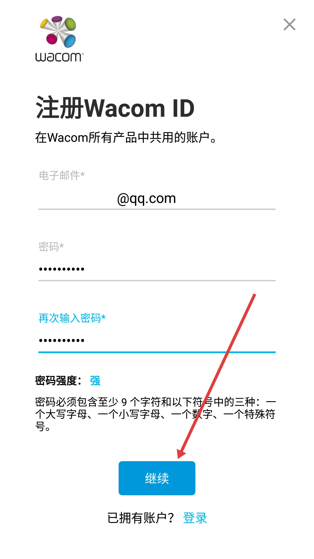 2、在注册页面,填写【电子邮件*】【密码*】【再次输入密码*】,密码需满足至少9个字符且包含三种类型符号。