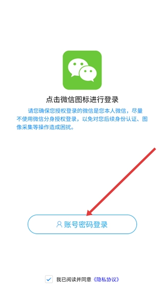 2、在登录方式选择页面,点击【账号密码登录】按钮,进入账号密码登录界面。