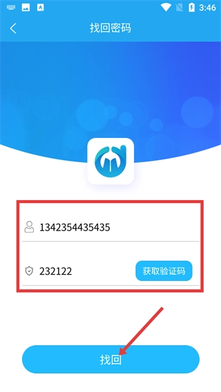 4、在找回密码页面,填写手机号和验证码后,点击【找回】按钮,完成密码找回操作。