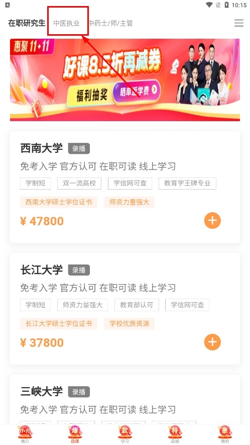 2、在选课页面,点击【中医执业-分类标签】,进入中医执业课程页面。