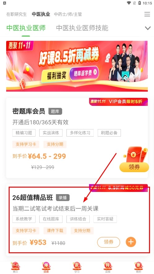 3、在中医执业课程页面,选择感兴趣的课程,如【26超值精品班-课程名称】。