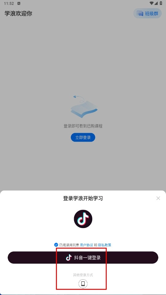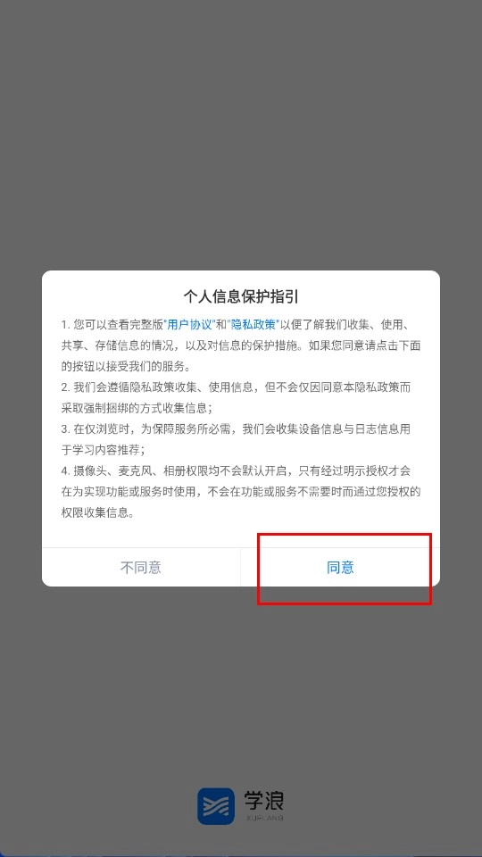 1、点击【同意-功能按钮】,以此确认同意学浪的《用户协议》与《隐私政策》。