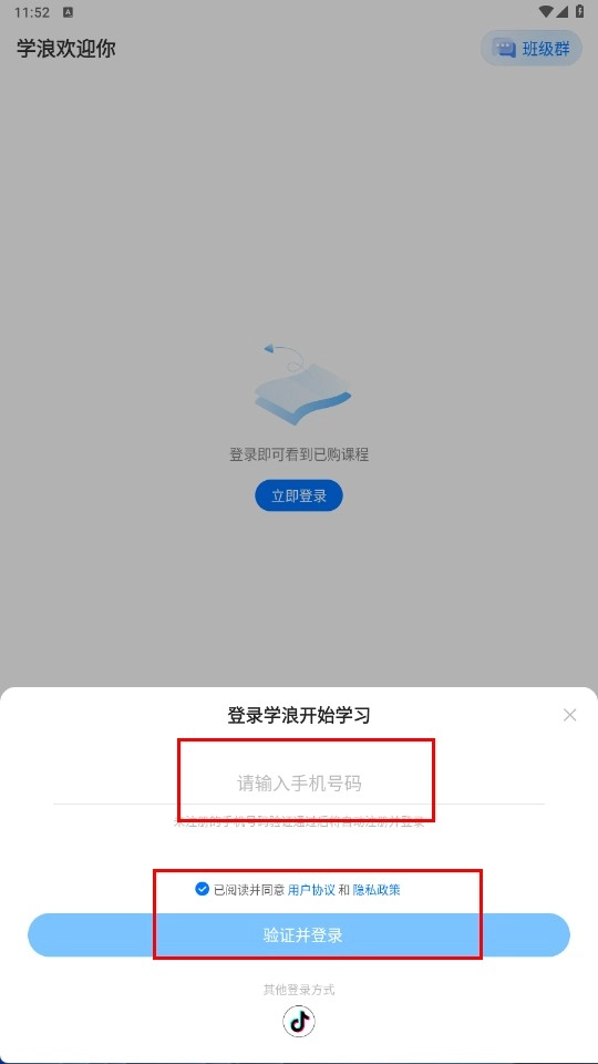 4、选择手机号登录时,输入手机号码并勾选同意协议后,点击【验证并登录-功能按钮】完成登录。
