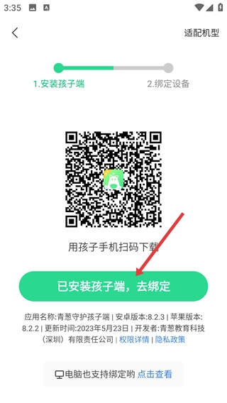3、在安装孩子端页面,用孩子手机扫码后,点击【已安装孩子端-去绑定】,进入扫码绑定环节。