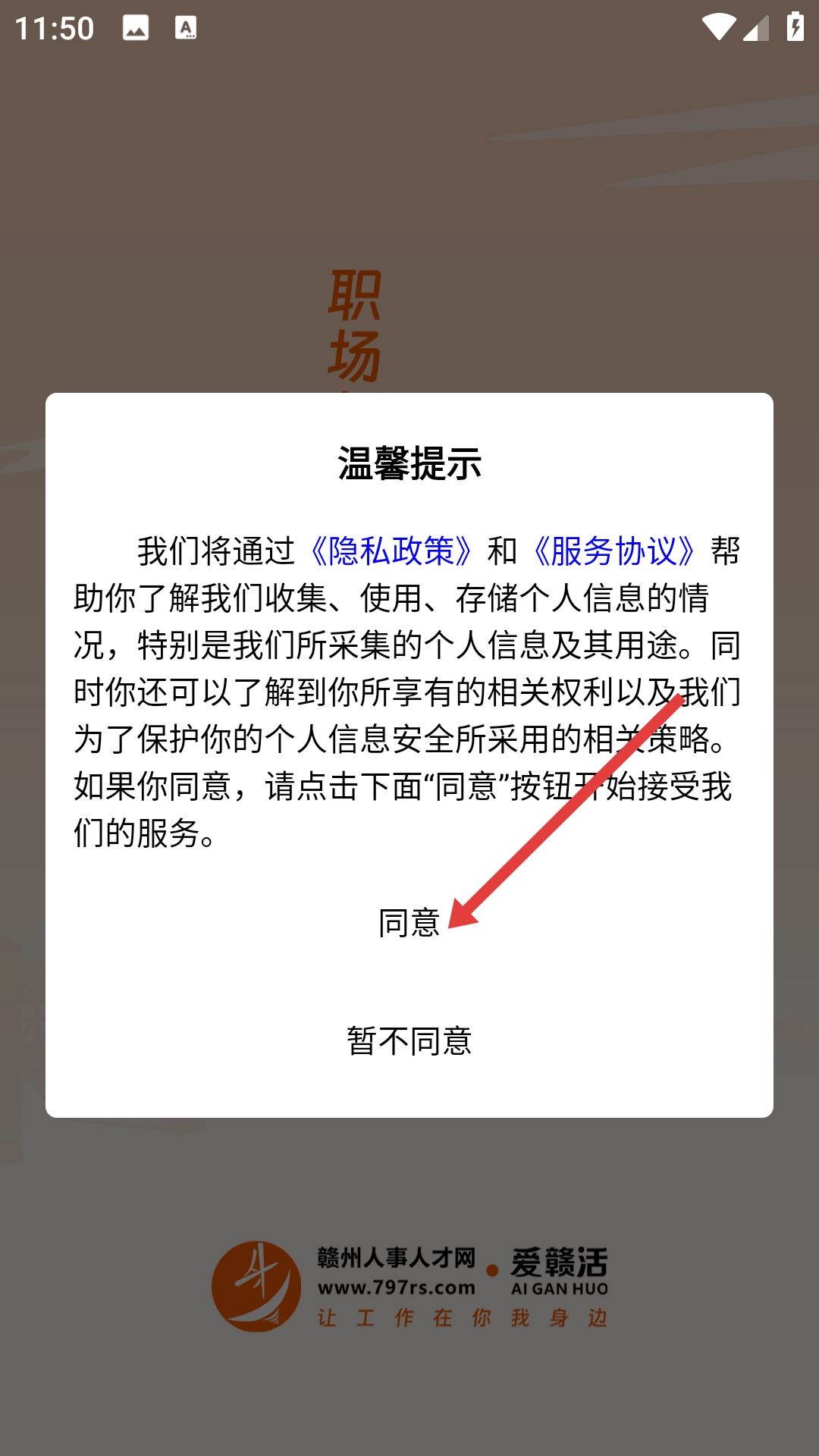 1、在温馨提示弹窗里,点击【同意】按钮,就能开始使用赣州人事人才网的服务;要是暂时不想同意,也可以点击【暂不同意】。