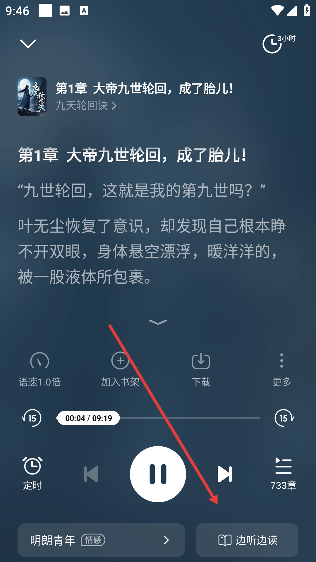 2、在书籍详情页面点击【听书】,进入听书播放界面。