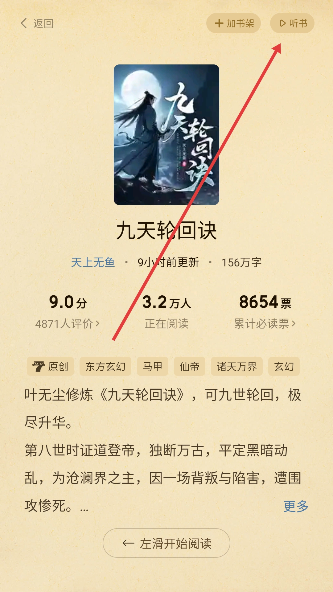 1、从书城的小说推荐榜单里挑选想要的书籍,比如《九天轮回诀》,然后进入该书的详情页面。