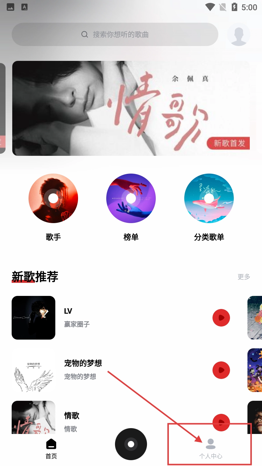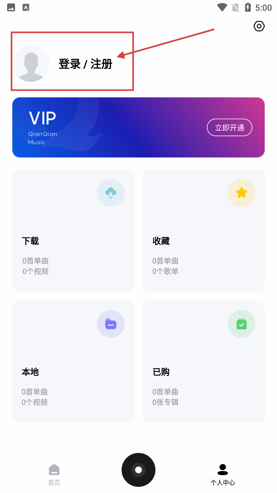在音乐首页,点击底部导航栏中的【个人中心】选项,就能进入个人中心页面。
