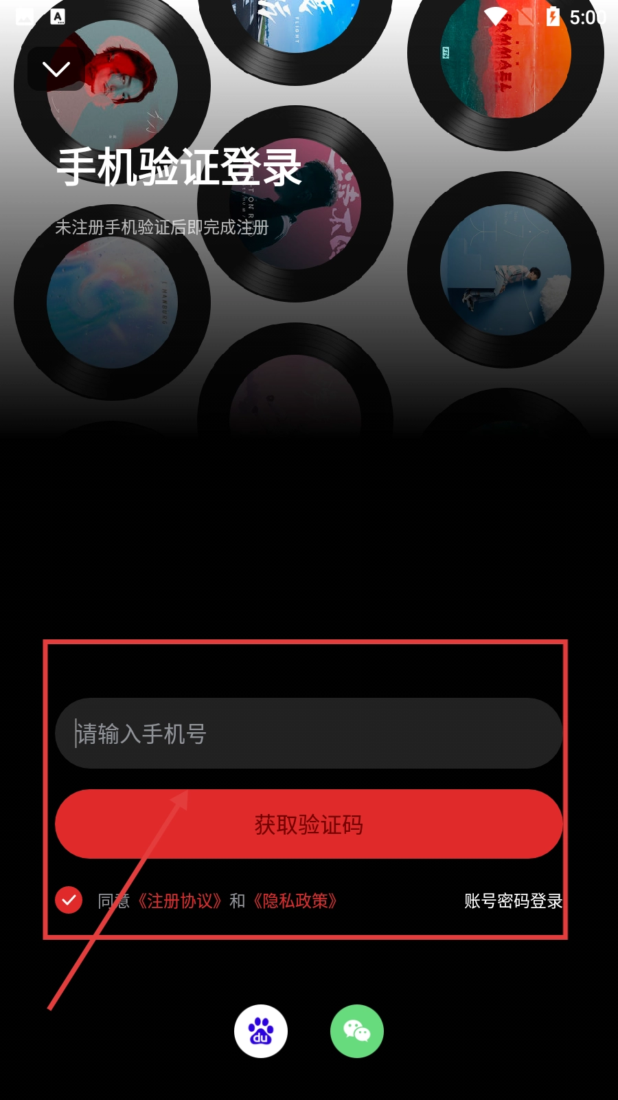 3、输入手机号并勾选同意注册协议和隐私政策后,点击【获取验证码】,可进入验证码输入界面。