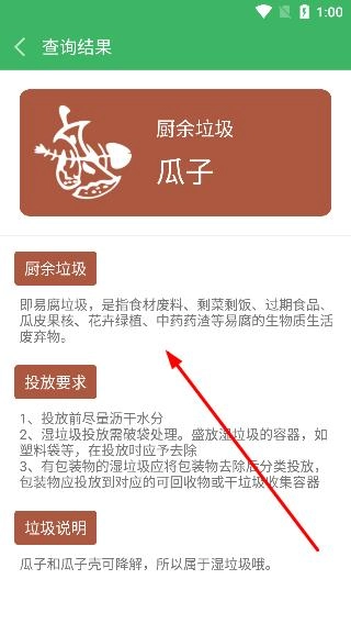 4、点击后即可查看【瓜子】的分类结果,包括所属类别、分类说明及投放要求等信息。