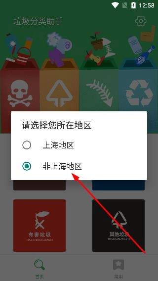 在垃圾分类助手的地区选择界面,选择【非上海地区】选项后,即可进入应用首页。