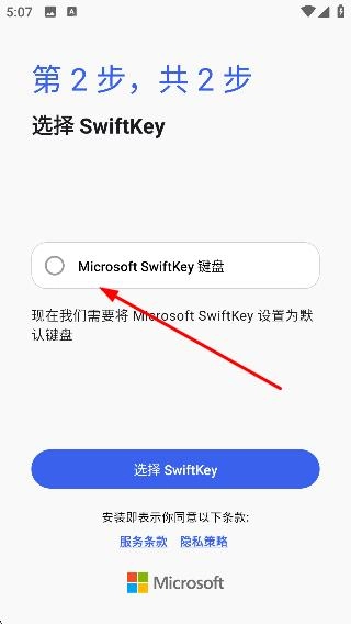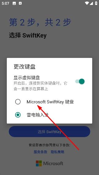 3、启用后进入“选择 SwiftKey”步骤,点击【选择SwiftKey】,弹出更改键盘窗口。