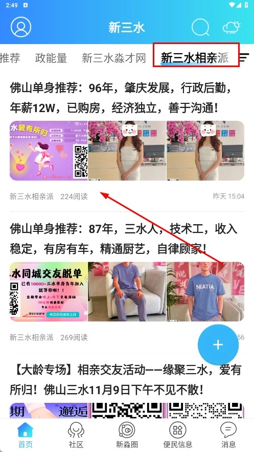 4、点击顶部【新三水相亲派-分类标签】,进入相亲派板块,查看单身推荐等内容。