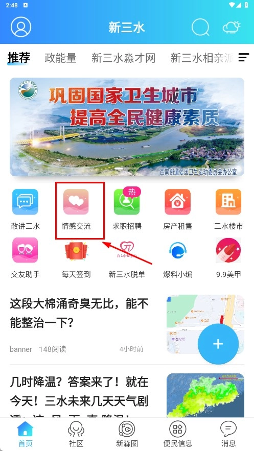 1、点击【情感交流】功能图标,进入情感交流板块,浏览相关帖子。