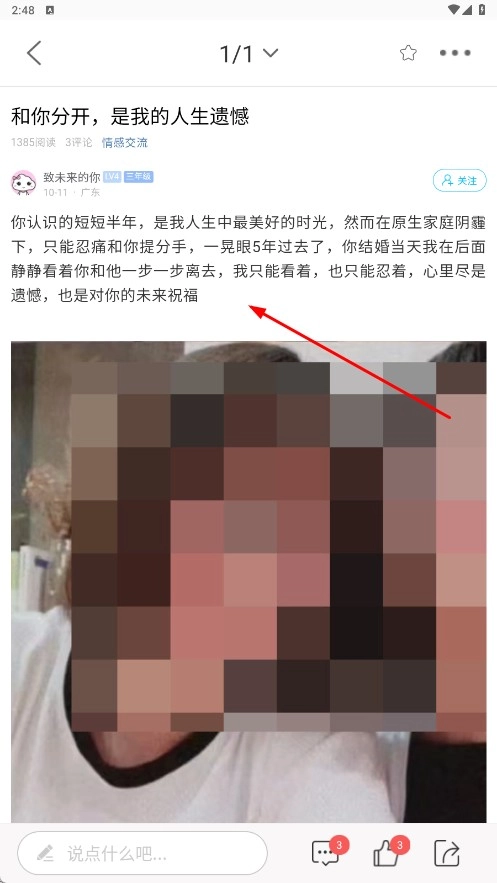 2、在情感交流页面,点击【和你分开是我的人生遗憾-帖子标题】,查看帖子详情。