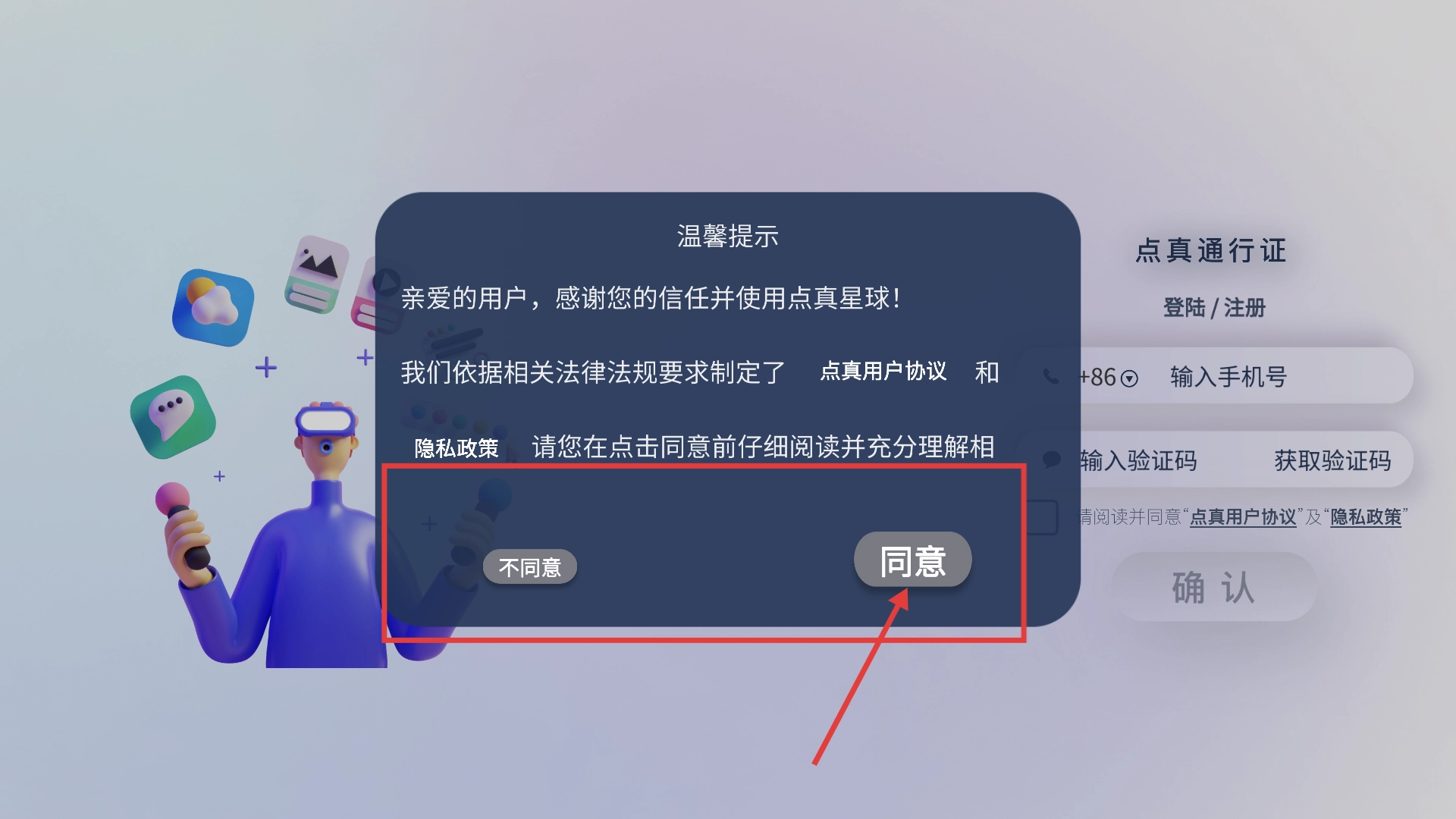 2、在温馨提示弹窗中,仔细阅读【点真用户协议】和【隐私政策】后,点击【同意】按钮,即可进入登录注册界面。