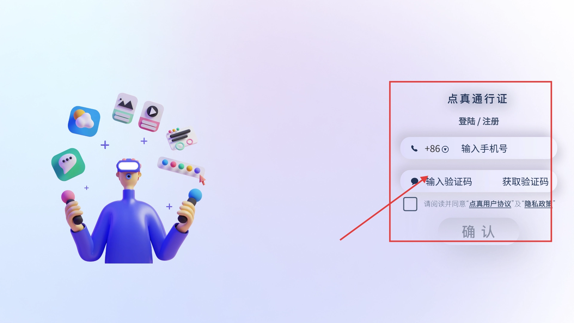 3、在点真通行证登录注册界面,输入手机号,点击【获取验证码】,输入验证码,即可完成登录或注册。