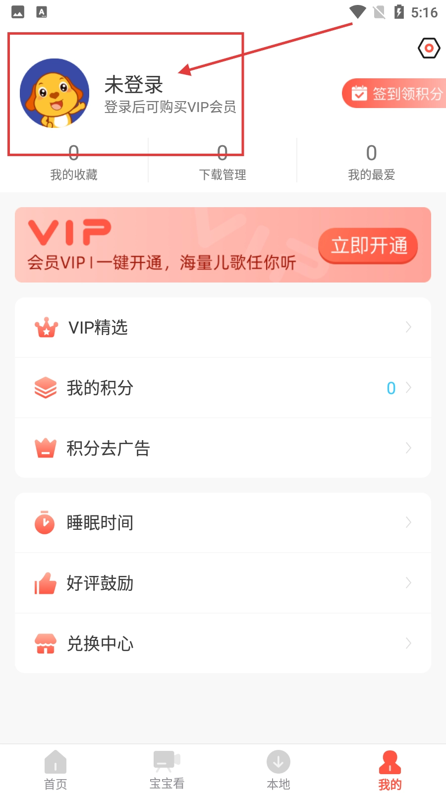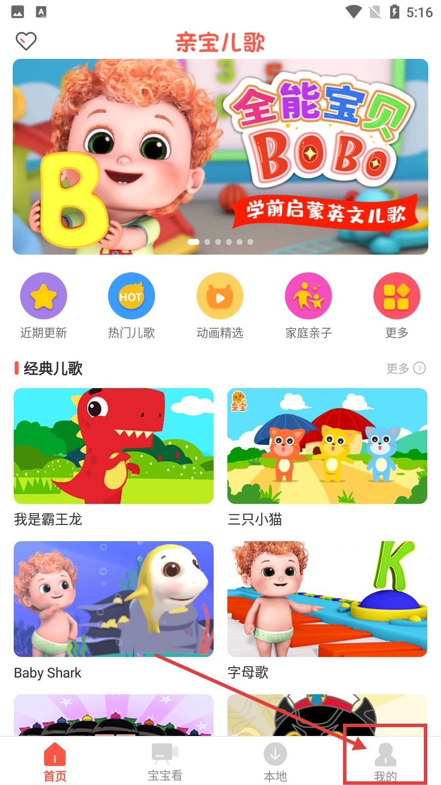 1、在亲宝儿歌的首页,点击底部导航栏中的【我的】选项,就能进入个人中心页面。