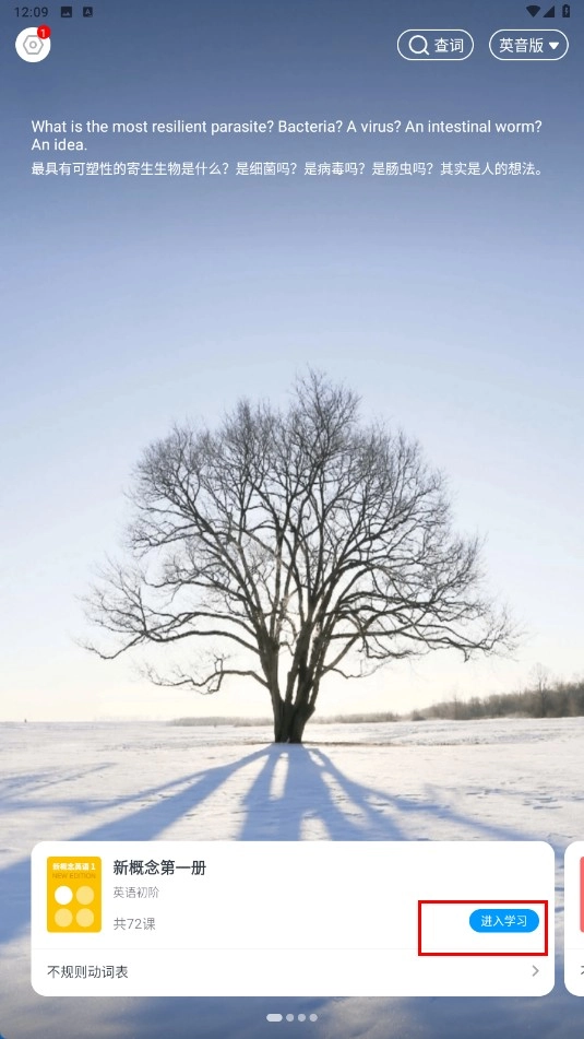 2、在首页找到【新概念第一册-课程卡片】,点击【进入学习-功能按钮】。