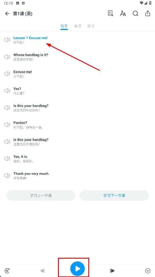 4、进入课程学习页,点击播放按钮,可学习句子发音等内容。