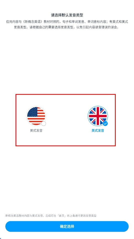 1、挑选默认的发音类别(例如英式发音),点击【确定选择】功能按钮。