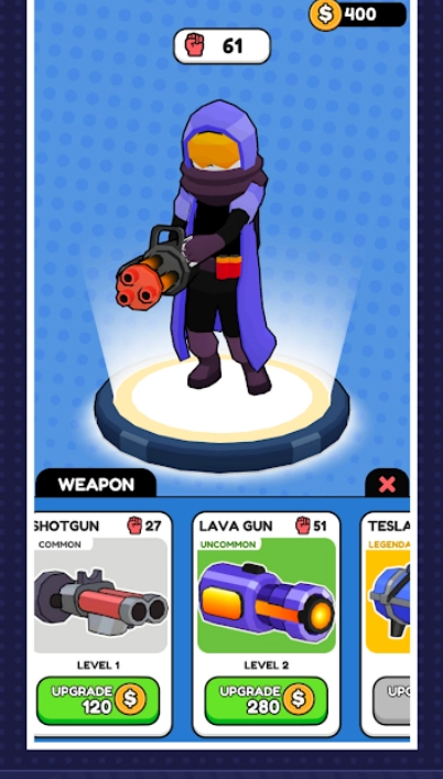 3.武器升级系统:击败敌人掉落金币,可在商店购买更强力的武器,如霰弹枪、激光炮等,提高输出效率,更快通关。