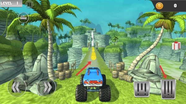 2、左侧箭头控转向,右侧按键控油门/刹车,驾驶蓝色卡车沿路径行驶,收集金币。