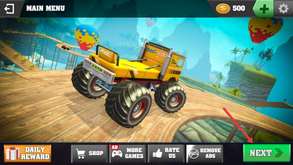1、在主菜单中点击NEXT选项,选择怪兽卡车,随后进入Level1的丛林赛道。