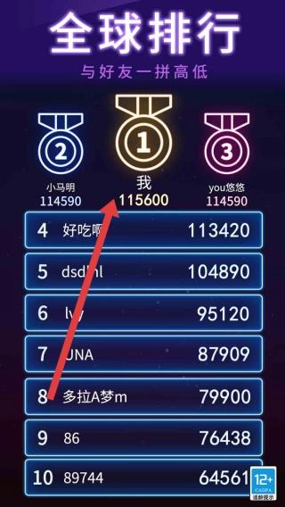 3、完成对局后,进入“全球排行”,查看“我”的名次(如第1名115600分),与好友比拼,争取上榜。