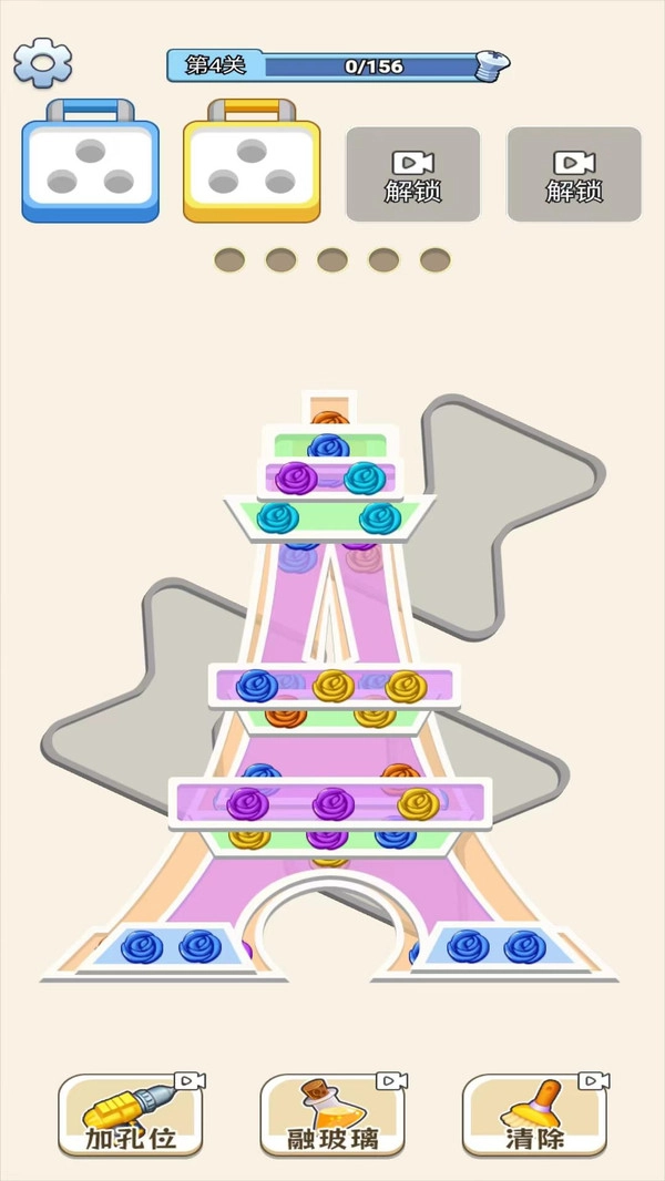 2、解锁当前关卡建筑后,自动开启下一关卡,新关卡的螺丝布局更复杂、目标要求更高,难度逐步提升。