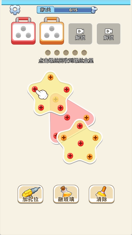 1、玩家点击屏幕上三个相邻且颜色相同的螺丝,就能消除这组螺丝。