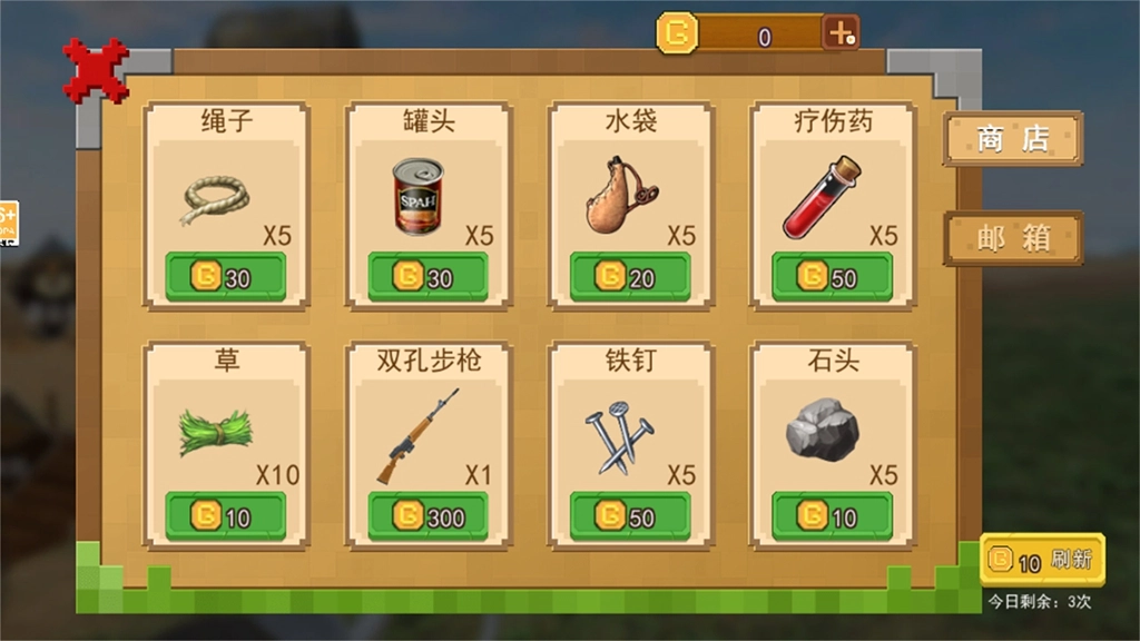 3、前往商店,用金币购买罐头、双孔步枪等物资,补充资源储备,应对未知危险。