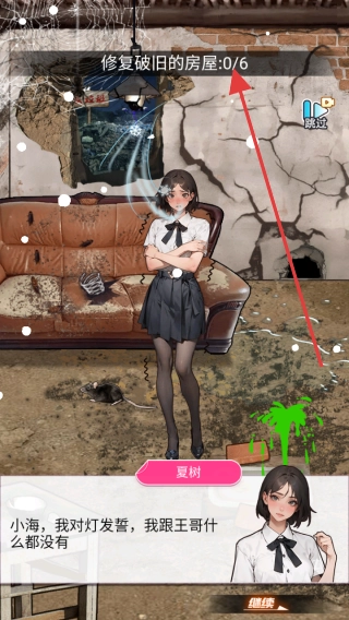 2、进入第二个场景,依据修复破旧的房屋0/6任务要求,寻找相关道具或触发修复机制,逐步完成房屋修复任务,推动剧情发展。
